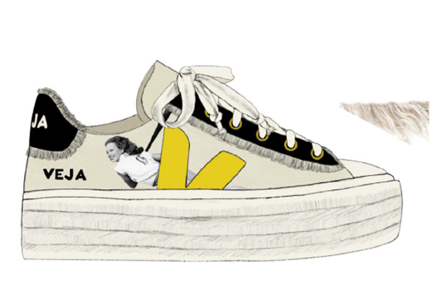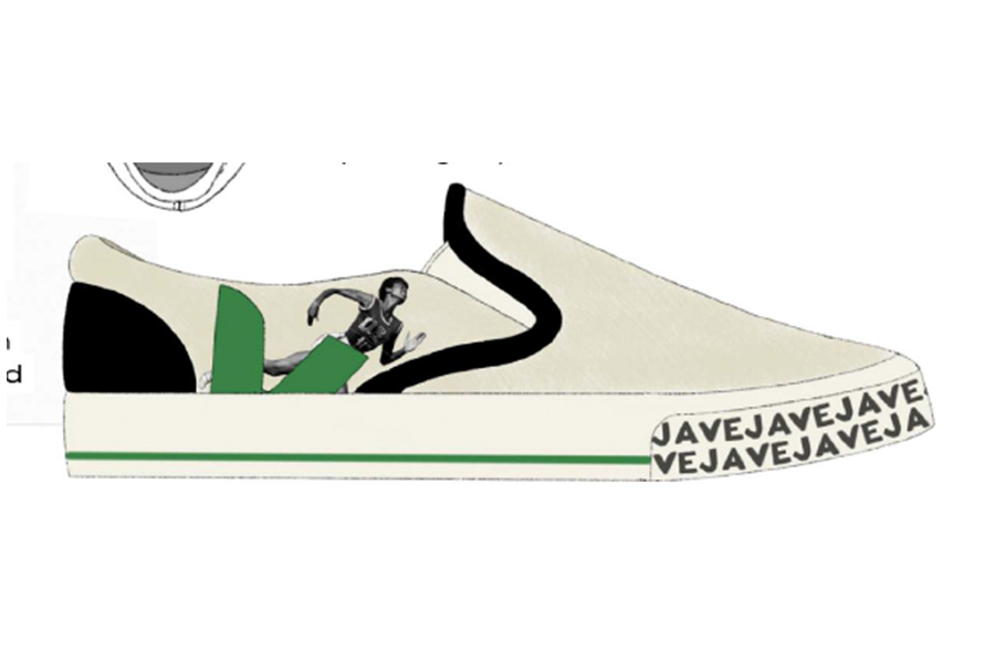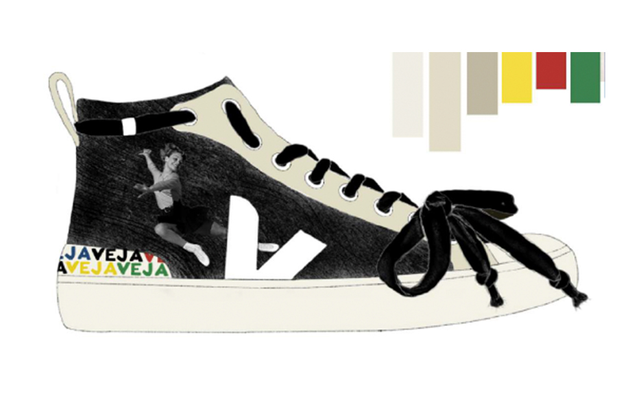 - Modèle 3 : Baskets décontractées et montantes composées d'une semelle en caoutchouc recyclé, d'une toile en coton biologique noir et de lacets en coton glat noir. La chaussure est ornée d'un logo V blanc découpé sur les deux côtés et d'une photo imprimée en noir et blanc sur le côté latéral de chaque chaussure. La semelle intermédiaire arrière est ornée du logo Veja dans les couleurs des cerceaux olympiques.