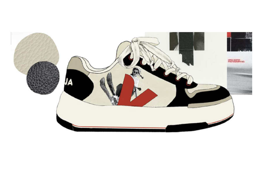 - Modèle 5 : chaussure basse décontractée avec une semelle intermédiaire légère en CM EVA, une semelle extérieure en caoutchouc recyclé, du cuir Mylo et des lacets en coton recyclé. La chaussure est ornée d'un logo V rouge découpé sur les deux côtés et d'une photo imprimée en noir et blanc sur le côté latéral de chaque chaussure.