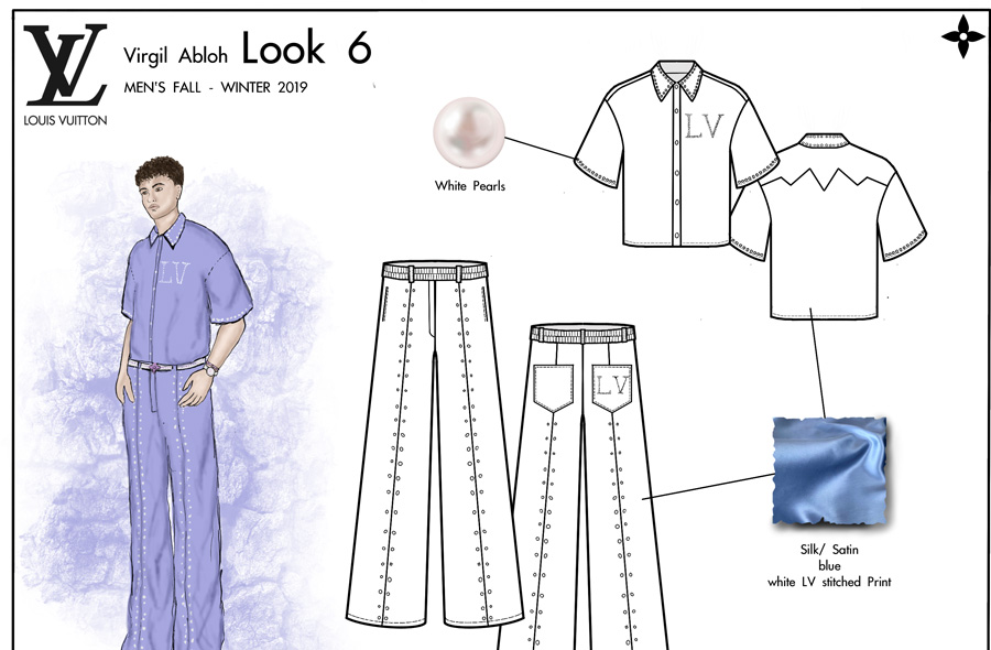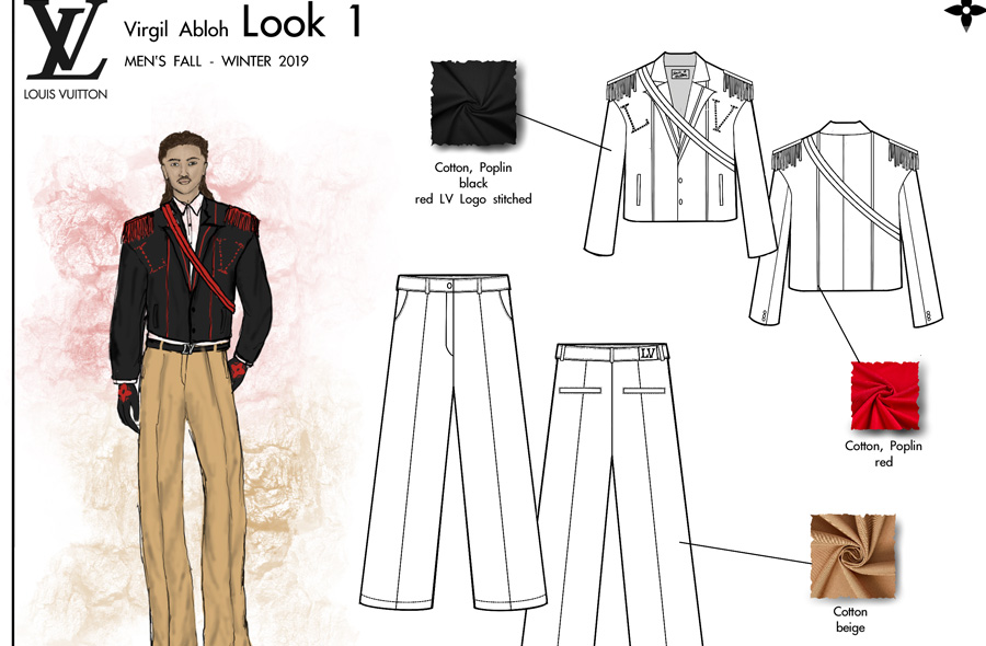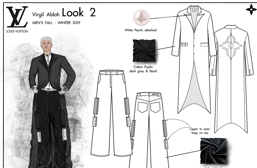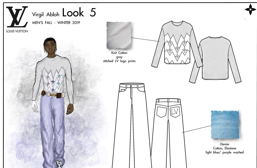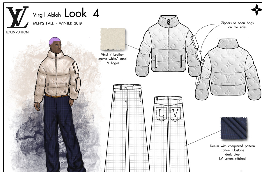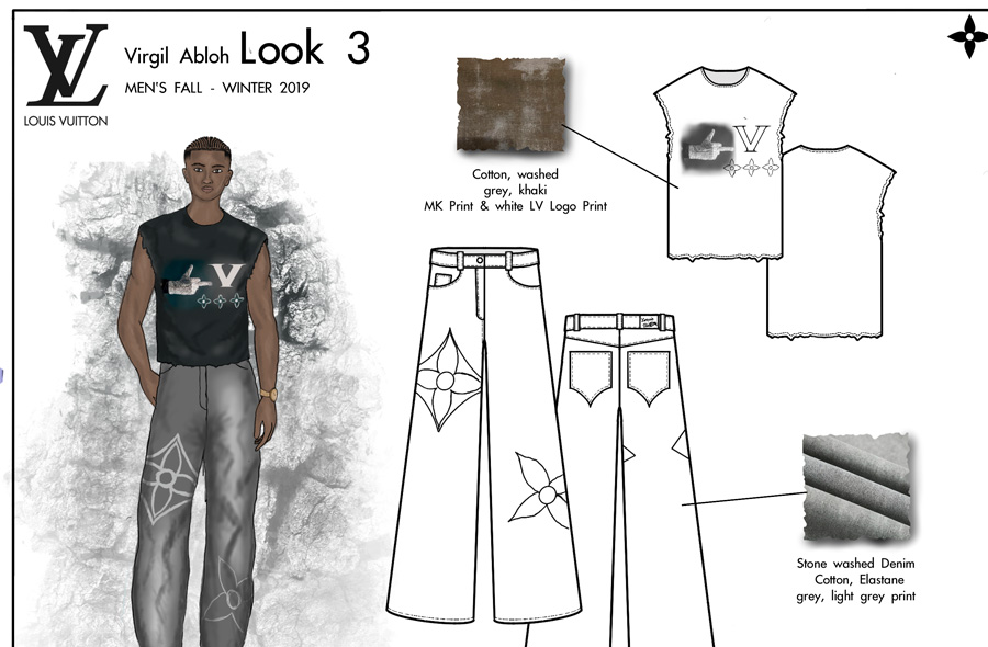 Pour ce projet, notre étudiant Conner devait créer une mini-collection cohérente avec une collection créée par le designer de mode de son choix. Il a sélectionné la Collection Automne / Hiver Homme 2019 créée par Virgil Abloh pour Louis Vuitton.