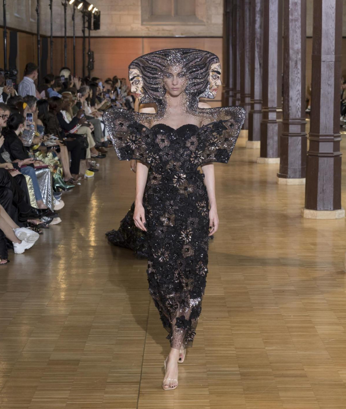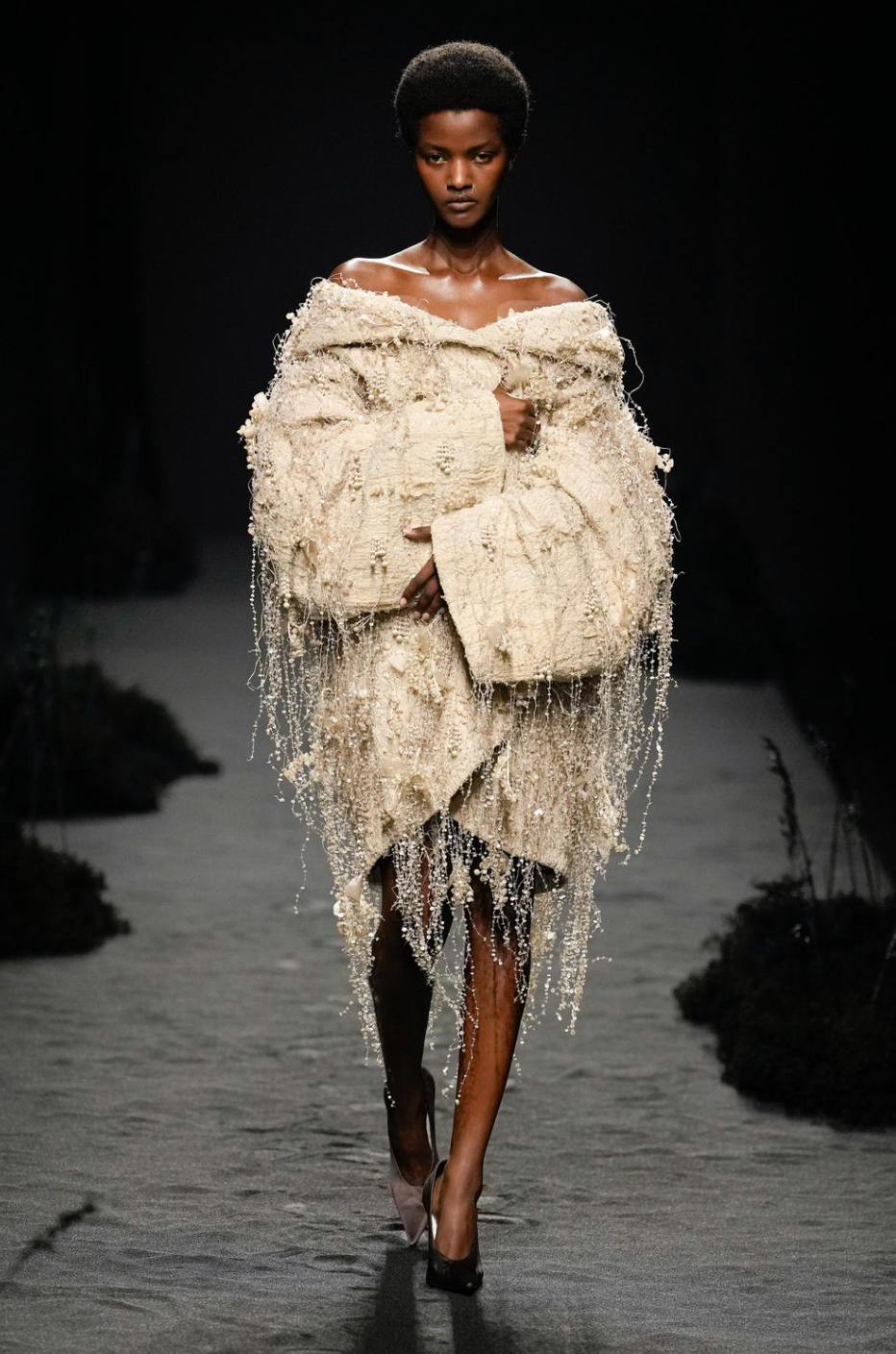 The "Aura" show by Rahul Mishra unveiled 52 models reflecting the spirituality of Hinduism. The creations featured intricate ruffles and pleats of tulle and chiffon, creating ethereal silhouettes mainly in black, symbolizing the mystery of the unknown. Mishra's use of surreal elements and hyper-embroidery added a dreamy and theatrical quality while maintaining a sober appeal that balanced the visual complexity. This collection masterfully fused technical skills with profound spiritual significance, illustrating Haute Couture's potential to convey deep themes and emotions.