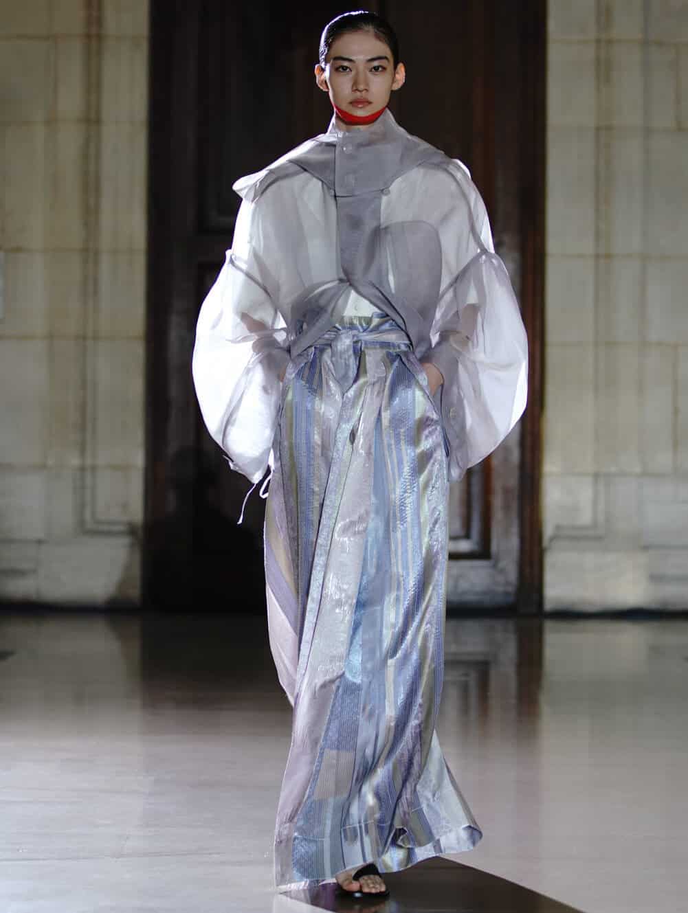 Japanese brand Mame Kurogouchi presented a collection entitled "The World, The Moment", which was inspired by traditional Japanese culture. The collection featured traditional Japanese motifs, such as waves, cherry blossoms and soft colors. The designs were modern and elegant, with loose silhouettes and sophisticated cuts.